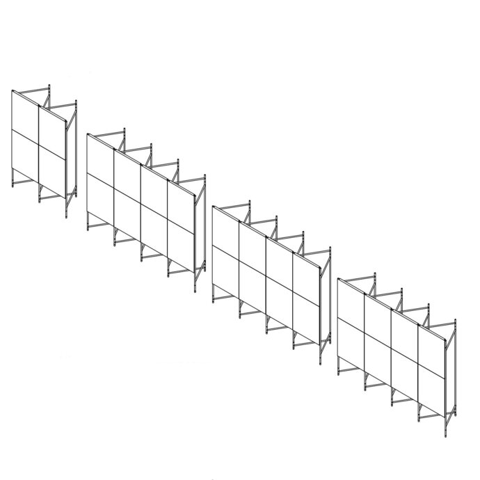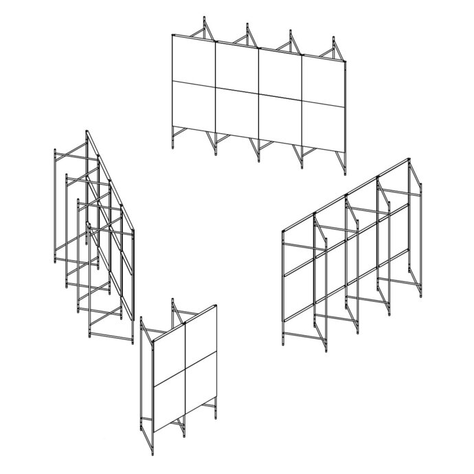 Die Raumfigur-Aufstellung bildet eine beidseitige Möglichkeit zur Bespielung der vier Ausstellungsmodule. Sie eignet sich als Forum oder zur Bespielung von Leerständen.