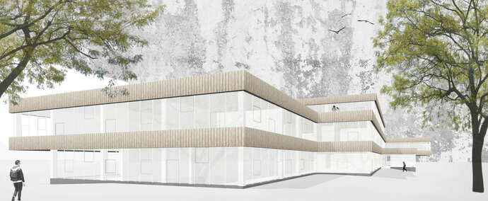 Der Siegerentwurf der STUDIO SF Simon Fischer & Architekten GmbH aus Mannheim überzeugte mit einem stringenten städtebaulichen Konzept dreier gegeneinander verschobener Kuben. Der Bestandsbau wird um einen weiteren Bauteil im Osten ergänzt, der eine angenehme Raumkante zum Zugang des Bürgerparks bildet. Der westliche Flachbau mit Bewegungszentrum bleibt erhalten. „Der Bestand wird so auf kluge Weise in ein neues Gebäudekonzept überführt, das vorhandene Qualitäten erkennt und wahrt sowie durch geschickte Ergänzungen erweitert“, lobte die Jury. Als besonders gelungen erachtete sie die Adressbildung der Schule sowie die Schaffung einer neuen, großzügigen Mitte mitFoyer und darüber liegendem Atrium. Positiv bewertet wurden auch die gut organisierten Grundrisse, die dem pädagogischen Konzept entsprechend verschiedene Aufenthaltsqualitäten von kommunikativ und aktiv bis ruhig und geschützt bieten. Der vollständige Erhalt des vorhandenen, parkartigen Schulgeländes und die vorgeschlagene Begrünung der Dachflächen stießen ebenfalls auf Zustimmung des Preisgerichts. „Insgesamt gelingt dem Entwurf eine souveräne städtebauliche und architektonische Neuformulierung des Schulgebäudes unter kluger Einbeziehung des Bestandes“, lautete das Juryurteil.
