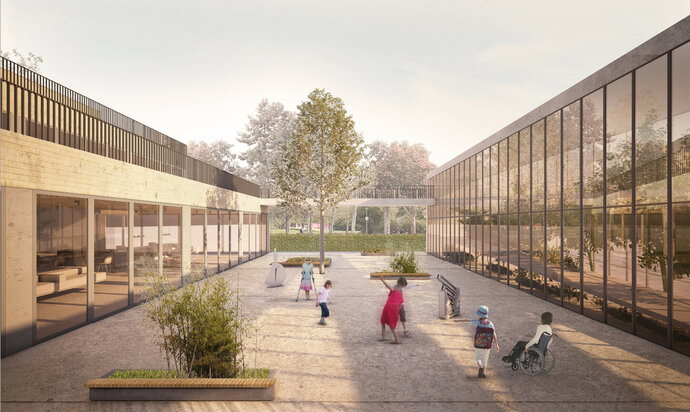 Nun soll das Bestandsgebäude, das in zwei Bauabschnitten 1978 mit der Grundstruktur und 1986 mit weiteren Klassenräumen, Fachräumen, Schwimmbadund physiotherapeutischem Bewegungszentrum erweitert wurde, an den erhöhten Raumbedarf angepasst und durch einen Neubau ergänzt werden. Darüber hinaus besteht hoher Sanierungsbedarf, vor allem in Bezug auf Anzahl und Ausstattung der Sanitärräume, die barrierefreie Erschließung sowie die Flucht- und Rettungswege für alle Funktionsbereiche. Über die Jahre ist der Anteil an Schülern mit komplexen und mehrfachen Behinderungen stetig angestiegen - aktuell sind rund 25 Prozent der Schüler auf einen Rollstuhl angewiesen. Neben der Flächenerweiterung sind daher auch vielfältige besondere funktionale Anforderungen zu erfüllen. In dem von der Wissenschaftsstadt Darmstadt ausgelobten nichtoffenen Realisierungswettbewerb wurden drei Preise und zwei Anerkennungen vergeben. Die Verfahrensbetreuung übernahmen a:dk architekten datz kullmann aus Mainz.