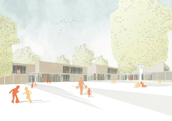Eine Anerkennung erhielten Spital-Frenking + Schwarz Architekten | Stadtplaner aus Dortmund für ihren selbstbewussten, architektonisch anspruchsvollen Entwurf. Die Verfasser platzieren einen teilweise dreigeschossigen Baukörper am Ende des Spitzwegrings, der unmissverständlich die Eingangssituation der neuen Käthe-Kollwitz-Schule markiert und die im Süden liegenden Unterrichtsgebäude effektiv mit den im Norden vorgesehenen Funktionsbereichen – Verwaltung, Turnhalle, Vorschule – verbindet.