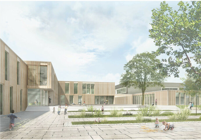 Der zweite Preis ging an Lindschulte Thillmann GmbH aus Koblenz. Der Entwurf besticht durch eine eindeutige Adressbildung der Schule. Die in Holzständerbauweise errichteten Ergänzungsbauten sind wohl proportioniert und fügen sich harmonisch in das Ensemble ein. Dabei bildet die neue Holzfassade einen klaren Kontrast zur bestehenden Betonstruktur. Das Herz der Schule ist der Haupteingang mit Aula und Mensa, die sich flexibel zusammenschalten lassen. Über einen Luftraum ist die Verwaltung im Obergeschoss mit dem Eingangsbereich verknüpft. Die Lernhäuser werden separat über den Schulhof erschlossen. Besonders angetan zeigte sich die Jury von der qualitätsvoll gestalteten Mitte der Jahrgangscluster: Ein multifunktionaler Raum, der über einen Luftraum mit dem Obergeschoss verbunden ist. Auch das Raumprogramm sowie die dargestellten Bauphasen konnten überzeugen.