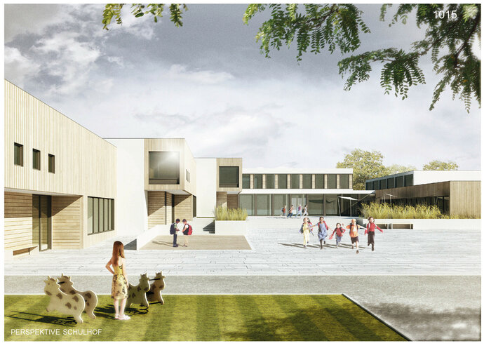 Als Sieger setzte sich das ortsansässige Büro aplus architektur durch. Die vorhandene Clusterarchitektur wird erhalten, behutsam an der Pausenhofseite ergänzt und durch eine neue Mitte mit „grünem Klassenzimmer“ städtebaulich neu gefasst. Während die Baukörper nach außen, Richtung Stadtraum, in ihrer aufgelösten Struktur erhalten bleiben, sind sie doch über eine äußere Überdachung strukturell miteinander verbunden. Besonders positiv bewertete die Jury den Erhalt der identitätsstiftenden Sichtbetonfassade der Bestandsbauten. Alle baulichen Ergänzungen besitzen eine Holzfassade und setzen sich somit deutlich vom Bestand ab. Die Haupterschließung erfolgt wie gehabt über den Spitzwegring. Der Aula-Neubau grenzt den dahinterliegenden Schulhof und die Unterrichtsbereiche nach außen ab. Eine barrierefreie Erschließung ist gegeben. Den Verfassern sei es auf beeindruckende Weise gelungen, die Nutzflächen ohne wesentliche Erhöhung von Verkehrsflächen zu steigern und die bestehenden, bislang kaum genutzten Grünflächen zu integrieren, lobte die Jury.