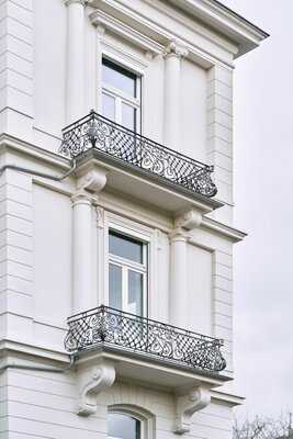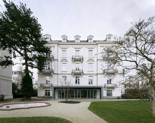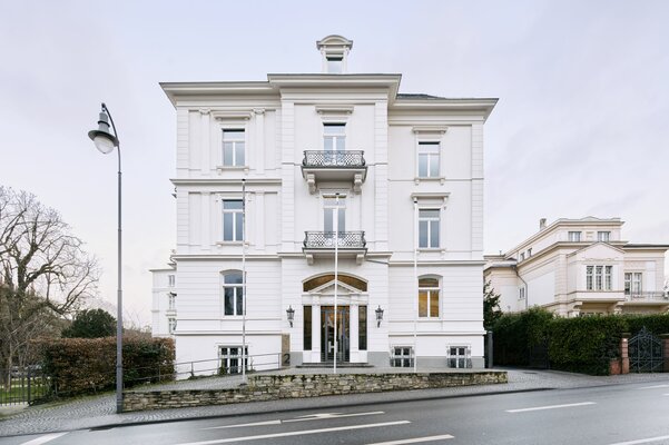 Sanierung der Fassade des denkmalgeschützten Gebäudes unter Einbeziehung der Unteren Denkmalschutzbehörde der Stadt Wiesbaden. Dabei wurde die vorhandene Fassadenbeschichtung komplett entfernt und neu aufgebaut. Beschädigte Stuckbauteile wurden restauriert bzw. erneuert. Der außen liegende Sonnenschutz ist dezent in das Fassadenbild integriert. Die einheitliche Farbgebung im hellen, mediterran anmutenden Farbton verleiht dem Gebäude eine erfrischende und zurückhaltende Eleganz.