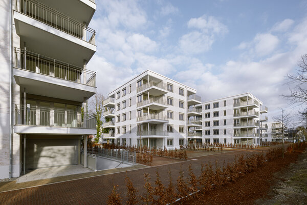 Die fünf Stadtvillen liegen fußläufig zum Rhein, in direkter Nähe zum Schlosspark Biebrich. Die durchgängig gestalteten Häuser unterschiedlicher Höhe stehen versetzt auf einem länglichen Grundstück. Helle Putzflächen im Wechsel mit farbig passendem Klinker gliedern die Fassaden. Drei eingerückte Ecken nehmen große Balkone / Terrassen auf. Die Grundrisse der Wohnungen sind als 2- und 3-Spänner konzipiert und reichen teils auch in das Souterrain. Eine Tiefgarage verbindet alle Häuser.