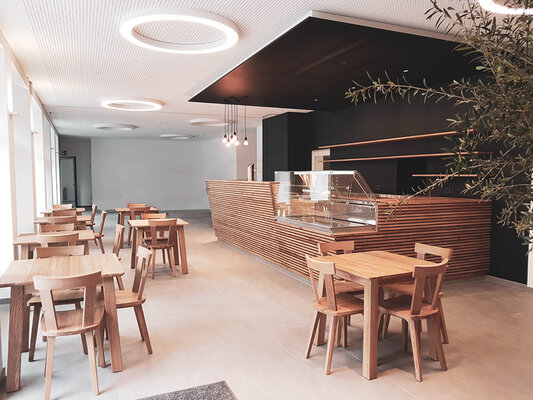 Die aus dem 17. Jahrhundert stammende Kirche wird seit 1952 als Gemeindezentrum genutzt. Der Umbau umfasste u.a. die Neuorganisation der Saal-erschließung, neue Funktionen der Gemeinde sowie die Einrichtung eines Cafés. Durch den teilweisen Abbruch von Zubauten des 20. Jahr-hunderts entstand ein neuer städtischer Platz, der als erhöhtes Plateau Bühne für Gemeindeaktivitäten bietet. Die wechselvolle Geschichte zeigt sich im Nebeneinander historischer und zeitgenössischer Bauteile und Oberflächen.