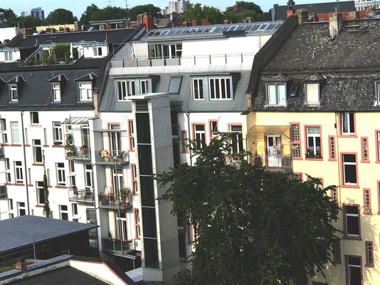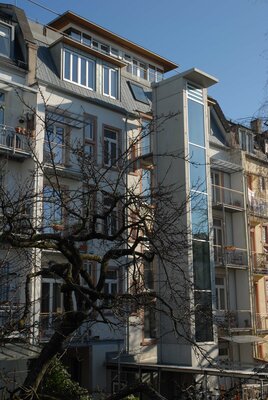 Die Realisierung eines Außenaufzugs an einem Gründerzeitwohnhaus in Frankfurts Nordend zeigt, wie mit moderner Architektur ein spannungsvolles, aber hamonisches Zusammengehen mit dem Bestand gefunden werden kann. Das Projekt bildet somit prototypisch ein Beispiel dafür, wie das immer noch sehr vernachlässigte Thema der altersgerechten Modernisierung von Altbausubstanz funktional und gestalterisch gelingen kann. Der Aufzug bedient alle Treppenpodeste und fährt auch den Keller an.