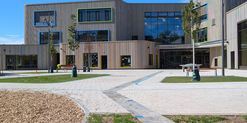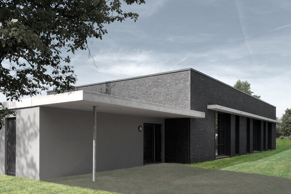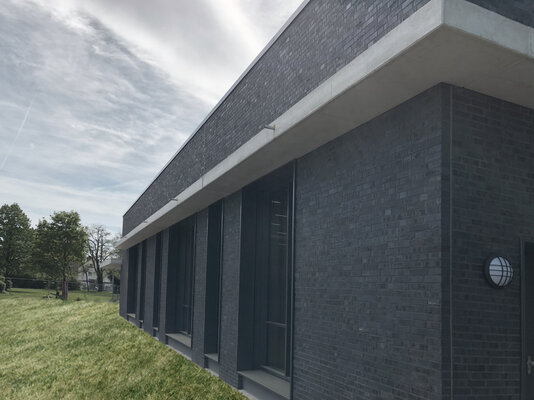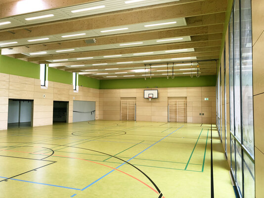 Das Gebäude ist über drei Eingänge zugänglich. Das Zentrum bildet die quaderförmige Turnhalle. Sie überragt den L-förmig angeordneten Nebenbaukörper. Betont werden die Eingänge und Baukörper durch ausladende Sichtbetonflachdächer. Die dunkle Klinkerfassade orientiert sich zurückhaltend an den Be-standsgebäuden. Vertikale Einschnitte geben Einblicke auf die innere Farbgestaltung preis. Die je nach Funktion farblich angelegten Innenwände schaffen visuelle Verbindung zwischen Innen- und Außenraum.