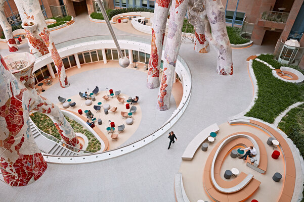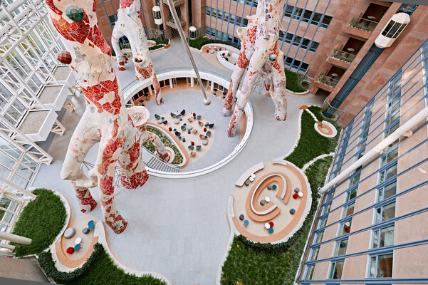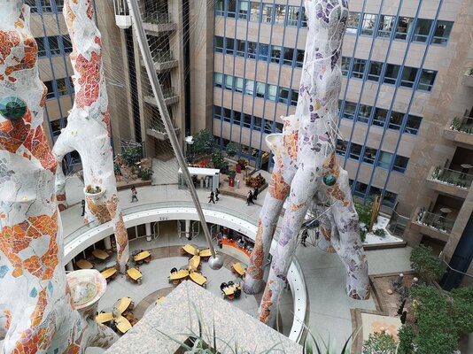Das Atricom ist ein Bürogebäude in Niederrad, das 1990 eingeweiht wurde. Die gestalterische und technische Modernisierung des Foyers wurde von MOW Architekten in enger Abstimmung mit dem Denkmalschutzamt umgesetzt. Gekonnt orientiert sich der Entwurf an der Kunst und schlägt durch die organische Innenarchitektur eine Brücke zur monumentalen Großplastik von Rolf Zehetbauer. Es sind attraktive Rückzugsorte für die Beschäftigten und Besucher entstanden, die zum Austausch und Verweilen einladen.
