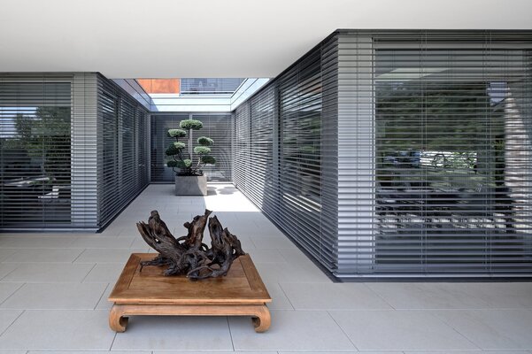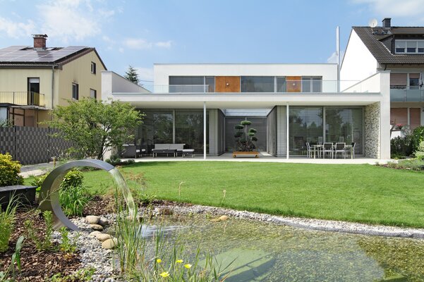 Auf einem idyllischen Grundstück ist ein Plus-Energie-Haus als Solitär entstanden, der sich konsequent zur umgebenden Landschaft orientiert. Die heter-ogene Bebauung der Nachbargrundstücke wird durch drei weitgehend geschlossene Außenwände ausgeblendet. Der Baukörper öffnet sich zu einem geschützten Atrium, das an einer Seite in die Terrasse und den Garten übergeht. Die Glasschiebetüren des Wohnbereichs lassen sich großzügig öffnen. Innen- und Außenraum gehen ineinander über.
