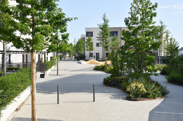 Das weitgehend autofreie Quartier bietet seinen Bewohnern vielfältige Grünflächen. Die Bepflanzung mit Stauden, Sträuchern und Bäumen orientiert sich am Bild der Kulturlandschaft. Eine fußläufige Querachse verbindet den östlichen Quartiersplatz mit dem Zentrum am Bahnhof. Hier öffnen sich die Geschäfte zu einer baumbestandene Piazza. Die durchgängige Materialverwendung und Gestaltung der öffentlichen Bereiche verleiht dem Quartier mit seinen individuellen Hausgärten ein harmonisches Gesamtbild.