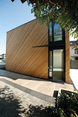 Ein zweigeschossiger Ausstellungskubus für zeitgenössische Kunst in Holzrahmenbauweise mit diagonal zulaufendem Lärchenholz an der Fassade, welcher sich von den angrenzenden Wohngebäuden in seiner Form und Erscheinung abhebt. Das offen gestaltete Parterre und das intimere Obergeschoss bieten mit vielen Freiflächen Platz für Kunst auf insgesamt 105 Quadratmetern.