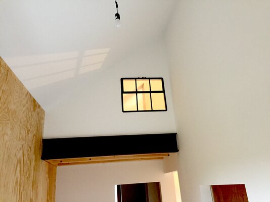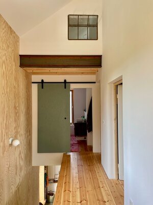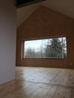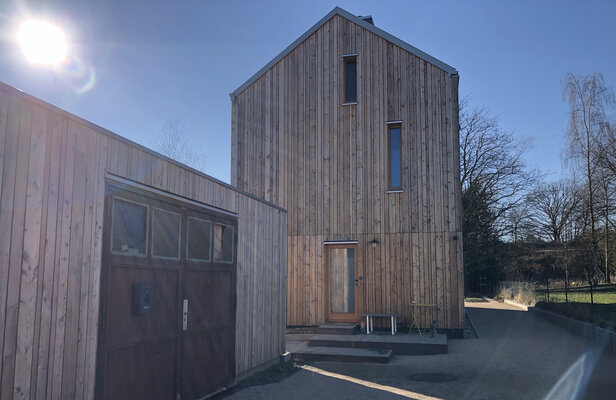 Das EH 40 Plus Wohngebäude mit einer Bruttogeschossfläche von 72 Quadratmetern, in reiner Holzständerbauweise, ist in die Wiesen gebettet und bildet mit der Garage einen Werkhof. Das Gebäude ist nicht unterkellert. Im Erdgeschoss Eingangsbereich, Bad, Treppenhaus, Wohn-Essbereich. Im Obergeschoss Schlafräume, Atelier, Bad. Im Dachspitz Schlafkojen. Das Atelier und das Treppenhaus erstrecken sich bis zum First. Ausgewählte Flächen der Wandbekleidung in Seekiefer. UPCYCLING – Bestehende Innenfenster und Türen werden in das neuwertige Erscheinungsbild integriert.