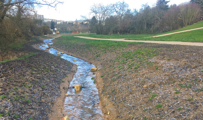 Jahrzehntelang war das Gewässer in ein Betongerinne gezwängt und das Tal durch Erwerbsgartenbau nicht betretbar. Somit waren Bach und Tal für die Menschen nicht erlebbar.