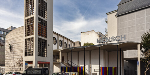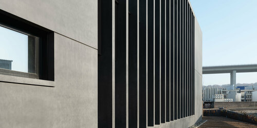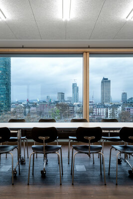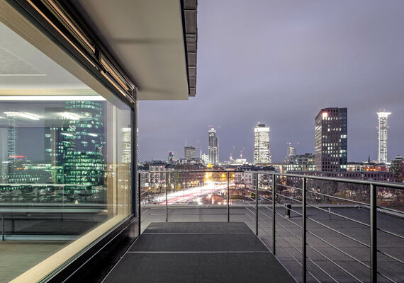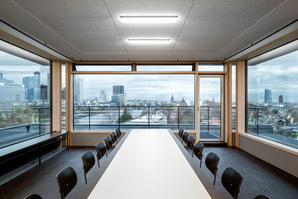 Das Belvedere bietet einen besonderen Blick auf Main und Stadtsilhouette. Die Aufstockung steht im Spannungsfeld zum historischen Bestand – der Holzskelettbau mit großzügigen Glasflächen und weit auskragendem Dach setzt sich deutlich vom massiven Bestand ab. Die skulpturale Stahltreppe verbindet Alt und Neu. Die Geschichte des Hauses wird weitererzählt – 1924 als Verwaltungsgebäude des Bauunternehmens Wayss und Freytag entworfen, erzählt die Fassade des Bauwerks noch heute von seinem Ursprung.