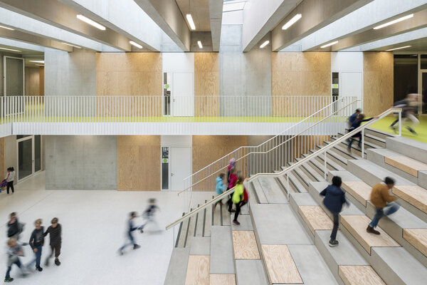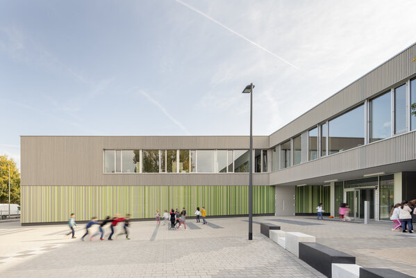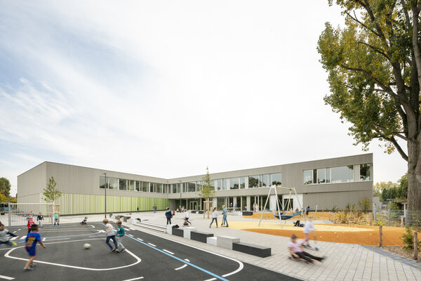 Das 2-geschossige Gebäude ist als dreizügige Grundschule mit Ganztag und 1-Feld Sporthalle für ca. 300 Schüler konzipiert. Das Herzstück der Schule bildet die zentrale, 2-geschossige Pausenhalle. Sie verbindet die drei Gebäudeflügel mit den unterschiedlichen Funktionen: im EG die Turnhalle, die Ganztagsräume und die Mensa, im OG die Klassen – als Cluster organisiert – und die Verwaltung. Als Pilotprojekt der Stadt Frankfurt wird hierbei ein Lerncluster mechanisch, der andere natürlich belüftet.