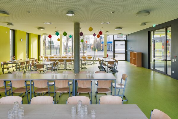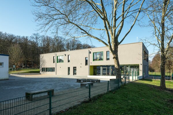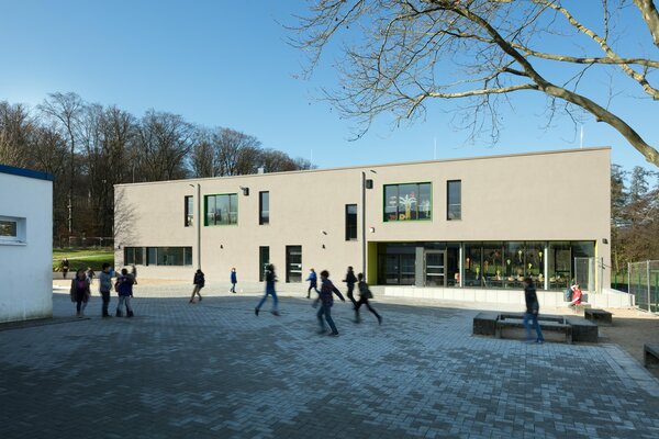 Als erweiterndes Angebot für die Nachmittagsbetreuung an der bestehenden Hardtwald-Grundschule in Friedrichsdorf/ Seulberg wurde ein neues Betreu-ungszentrum auf einem benachbarten Grundstück errichtet. Der in Massiv-bauweise ausgeführte, zweigeschossige Neubau gliedert sich in ein Erd-geschoss mit Hauptzugang, Speisesaal (100 Sitzplätze), zugehöriger Küche und einem Verwaltungsbereich, sowie den gesamten Betreuungs-bereich im Obergeschoss um einen zentralen, offenen Bereich mit 4 Raumgruppen.