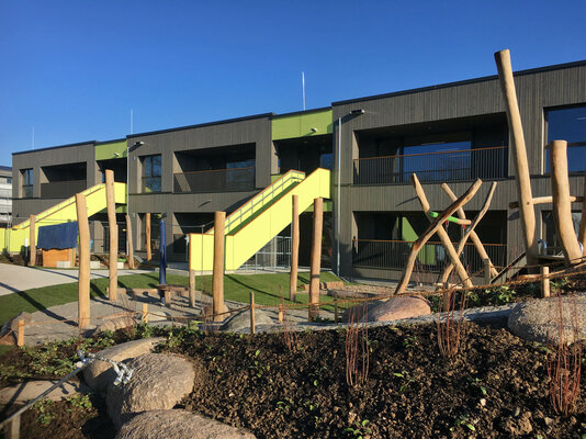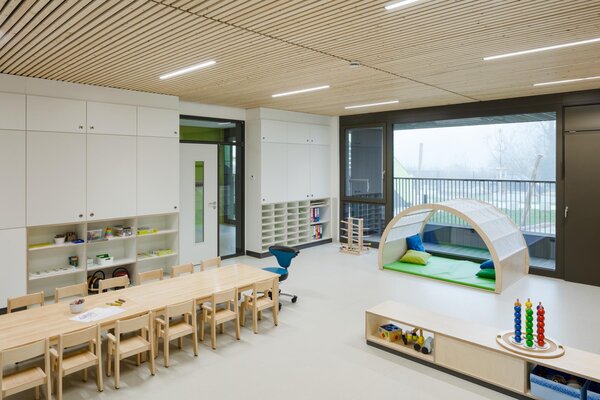 Der 2-geschossige Neubau der Bewegungskindertagesstätte beherbergt ca. 90 Kinder von 1-6 Jahren in einem kompakten und funktionalen Holzelementbau. Die Innenräume sind liebevoll gestaltet und der Baustoff Holz sorgt für ein angenehmes Raumklima. Alle Fünf Gruppen (Träger ist das Familienzentrum) haben direkten Zugang zu einem großzügigen und kreativ gestalteten Außengelände. Die Spielflure und Gruppenräume erweitern durch Aufweitungen in den Außenraum das räumliche Angebot.