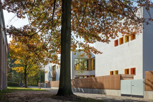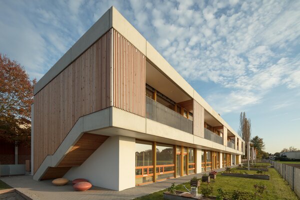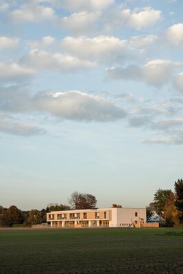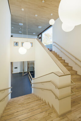 Das zweigeschossige Kita-Gebäude zeigt sich als klare Gebäudeskulptur weithin sichtbar am Feldrand und prägt den Ort zu jeder Tages- und Nachtzeit. Die sechsgruppige Kita ist Teil der baulichen Anlagen des Sportzentrums. Vielfältig baulich ge-fasste „Raumvernetzungen“ mit vorgelagerten Spiel- und Balkonterrassen und dem Frühstückshof ermöglichen das Inein-andergreifen von Innen- und Außenräumen. Die gewählten Materialien und Farben stehen im Einklang mit der Natur und ihrem Wandel der Jahreszeiten.