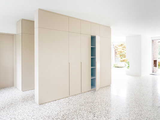 Ein Bungalow aus den 1970iger Jahren bildet die Basis für diesen Umbau. Die Architekten haben durch großzügige Einschnitte in den Bestand einen lichtdurchfluteten, nach Westen orientierten, Wohn-Essbereich mit offener Küche geschaffen. Daran anschließend befindet sich nach Osten ausgerichtet, der private Bereich mit Schlafzimmern und Bädern. Das Zusammenspiel fein nuancierter Farben und Oberflächen sowie ausgewählte Möbelstücke der Bauherren runden das Gesamtkonzept des Hauses ab.
