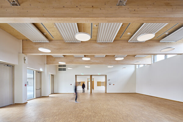 Das Bürgerhaus präsentiert sich im dörflichen Umfeld mit klassischer Ein- und Mehrfamilienhausstruktur als eingeschossiger Baukörper mit einer klaren, monolithischen Architektursprache. Der Neubau umfasst zwei Nutzungen, die sich synergetisch ergänzen: die freiwillige Feuerwehr und ein Bürgerhaus mit zwei unterschiedlich dimensionierten Sälen und großzügigem Foyer. Das Bürgerhaus definiert einen attraktiven Platz als sozialen Mittelpunkt und zentrumsbildenden Raum mit hoher Aufenthaltsqualität.