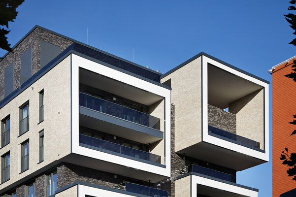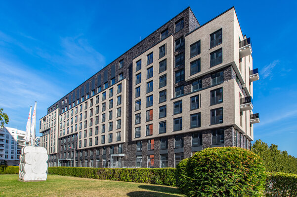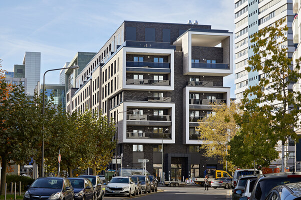 Im Lyoner Quartier, Frankfurts neuem Wohnviertel, entstand ein markantes Wohngebäude mit rund 300 unterschiedlich dimensionierten Wohnungen, einer Kindertagesstätte, Gewerbeflächen und einem Restaurant im Erdgeschoss sowie einer Tiefgarage. Großzügige Dachterrassen und ein grüner Vorplatz bieten den Bewohnern attraktive Außenräume. Die Fassade gliedert sich in kleinere Unterformen und unterstreicht mit hochwertigen Materialien und hohem Fensteranteil das Konzept des modernen, urbanen Wohnens.
