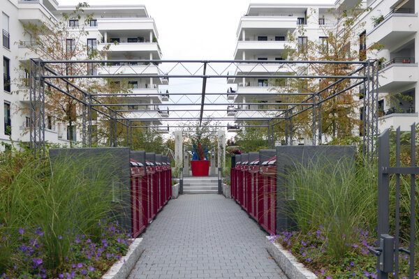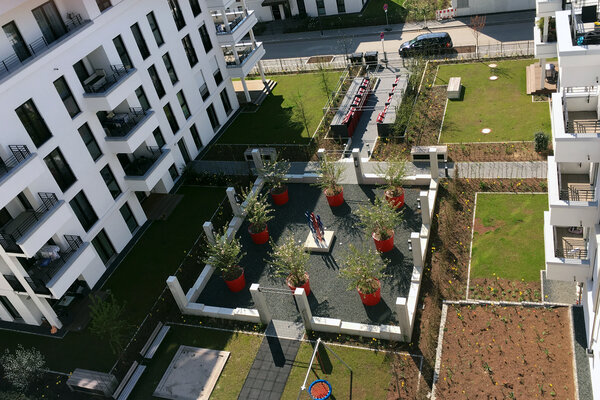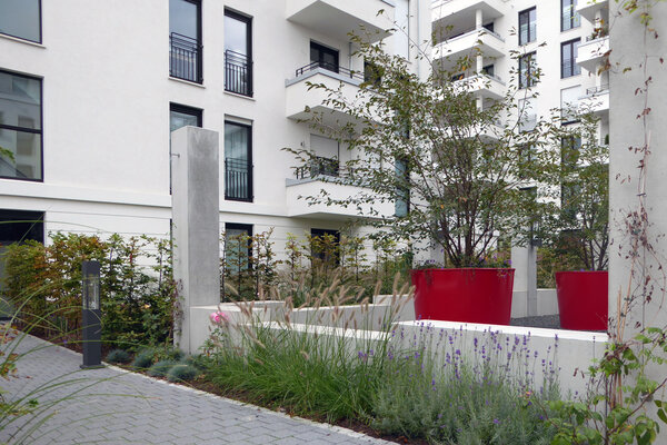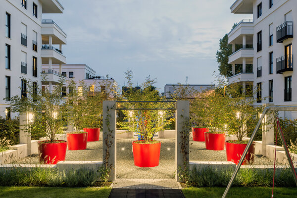 In zentraler Lage des Stadtquartiers „Europaviertel“ entstanden auf einer Fläche von 4960 m2 vier Mehrfamilienhäuser mit insgesamt 62 Wohnungen. Die Freianlagen umfassen 3520 m2. Der Großteil der Grünflächen wurde als intensive Dachbegrünung einer Tiefgarage realisiert. Kernstück der Freianlagen bildet eine Skulptur des Künstlers Bernhard Jäger im Innenhof, umgeben von übergroßen roten Pflanzgefäßen. Materialien und Ausstattungselemente orientieren sich an der Formensprache der Architektur.