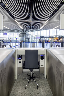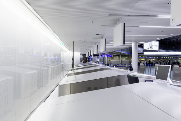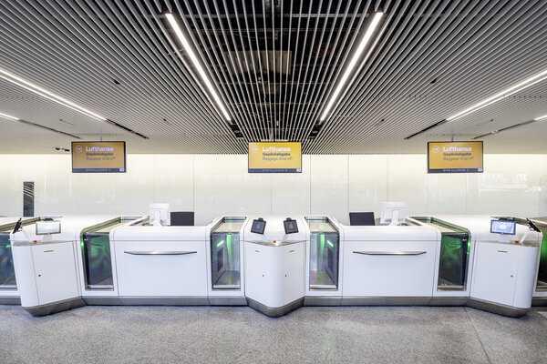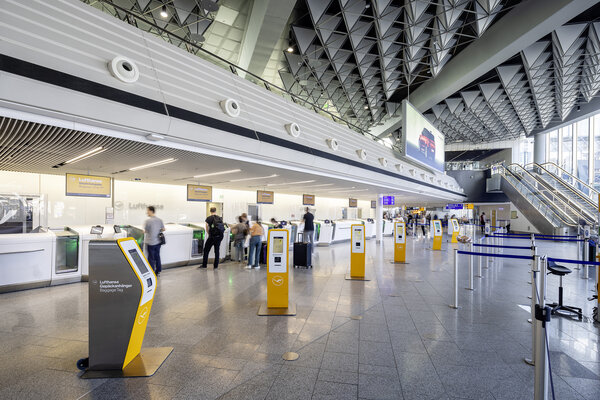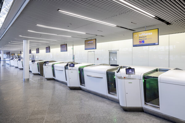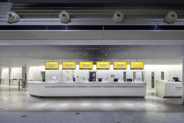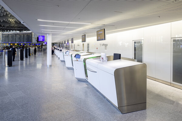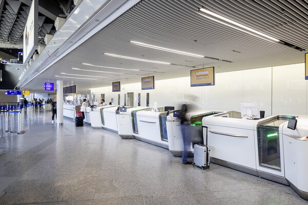 Am Frankfurter Flughafen erwartet Fluggäste ein neuer Check-in-Bereich mit benutzerfreundlichen Self-Service-Automaten, die in den 50 Jahre alten architektonischen Kontext des Terminal 1 integriert wurden. Durch eine Überformung der Decke öffnet sich der Raum unter der Galerie zur Passagierhalle. Die Reisenden werden eingeladen an den neuen Automaten die Gepäckaufgabe selbst vorzunehmen. Das neue System ist so konzipiert, dass bei Bedarf zusätzlich Personal an Schaltern zur Verfügung steht.