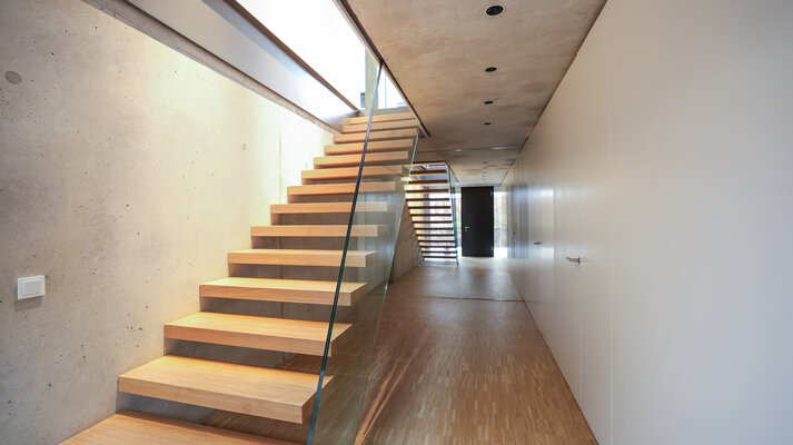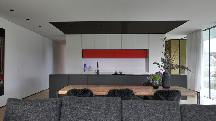 Die kraftvolle Architektur des Gebäudes entwickelt sich aus dem Übergang zur Landschaft. Die Innen- und Außenbeziehungen, das Spiel von Licht und Schatten und die reflektierende Wasseroberfläche erzeugen eine hohe räumliche und emotionale Qualität. Sorgfältige Materialwahl sowie die effiziente Raumnutzung charakterisieren das Interieur. Das Wohnhaus ist als vorgefertigter moderner Holzständerbau realisiert. Geheizt und gekühlt wird über Erdwärme. Eine Fotovoltaikanlage erzeugt Strom.