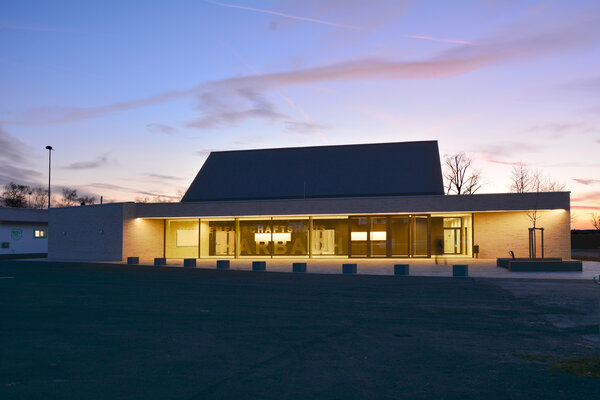 Das neue DGH markiert den Dorfeingang mit einer der Bedeutung entsprechenden Präsenz. Dabei dominiert der monolithische Baukörper des Saals den Neubau und zitiert mit seiner Gestaltung die ortstypischen Scheunen. Der Eingang im eingeschossigen Sockelbaukörper öffnet sich mit einer einladenden Geste zum Dorf. Durch diese Öffnung ist der Hauptbaukörper von außen sichtbar und durch die konsequente Weiterführung der Außenwandmaterialien auch im Inneren als eigenständiger Kubus ablesbar.