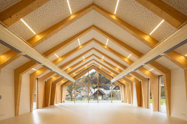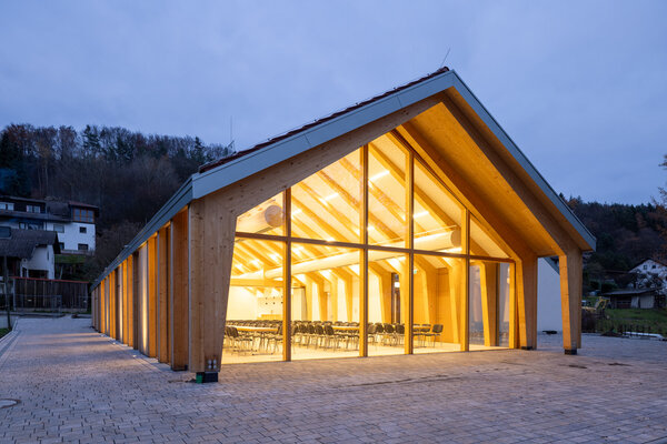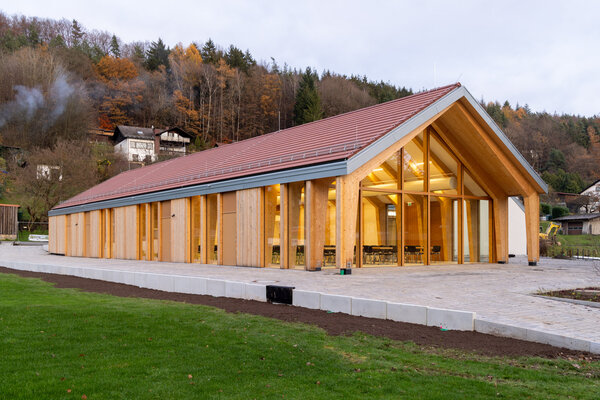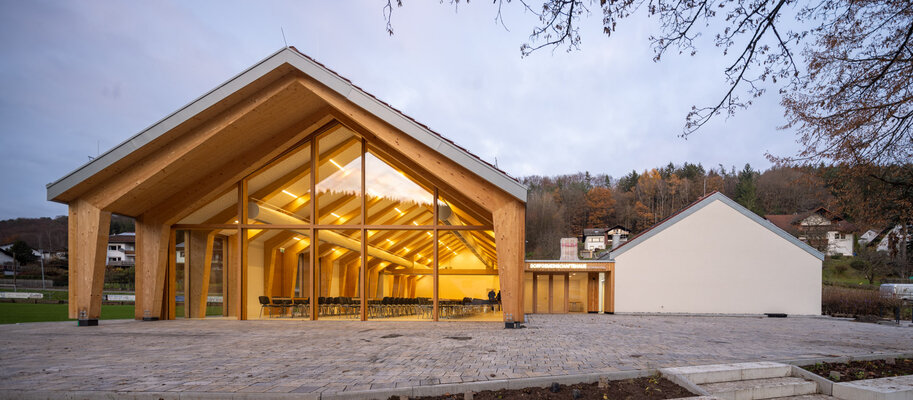 Das zentrale Veranstaltungs-/Versammlungsgebäude aller Ortsteile als modern interpretierte Scheune. Rückbau aller Flächen auf den Rohbau, Erneuerung und Erweiterung der Saalkonstruktion, neue Technik (Wärmepumpe/PV), die Umgestaltung des Umfeldes (neue Sichtverbindung/Erschließung von Ortsdurchfahrt zu Haupteingang). Ein eher geschlossener Baukörper beinhaltet Funktionsräume, ein offener mit Dreigelenkrahmen, schwellenlosen Verglasungen und Ausgängen schafft Verbindung zu den Freianlagen.