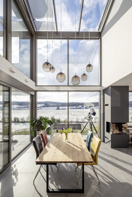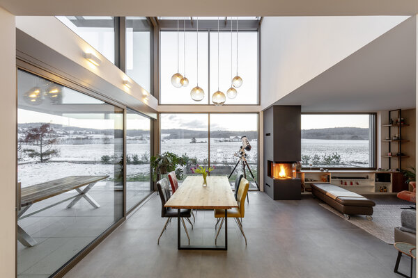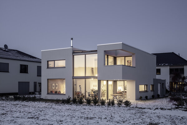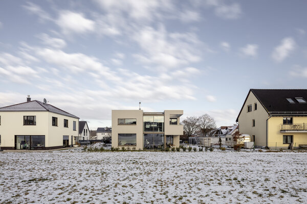 Neubaugebiet, Feldrandlage und viel Aussicht waren zunächst die Entwurfsparameter. So entstand zum angrenzenden Feld ein weit offenes Gebäude, das sowohl Innen als auch Außen den Blick in die Weite nutzt.