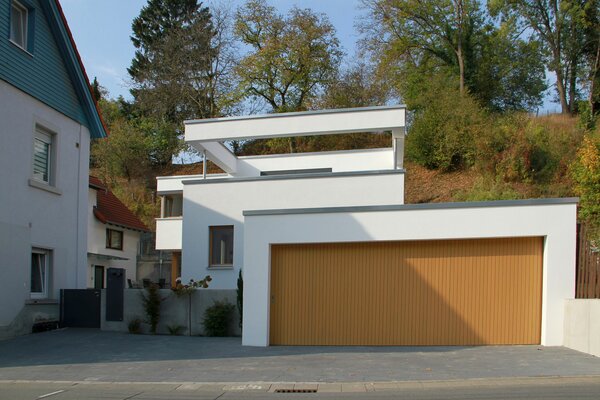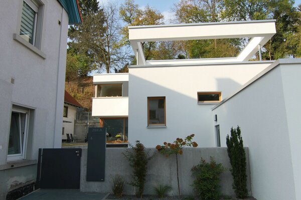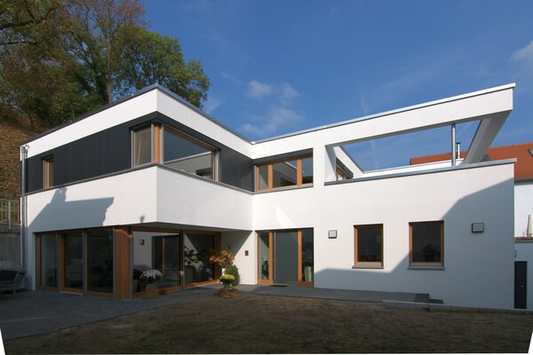 Neubau eines Einfamilienhauses in einem Ortsteil von Bensheim: Durch Abbruch eines vorhandenen Gebäudeteils öffnet sich ein Baufeld, welches durch eine vorhandene Stützwand und die umgebenden Baukörper begrenzt ist. Durch die L-förmige Anordnung des Gebäudes, angelehnt an die Stütz- wand, entsteht im Zusammenspiel mit den vorhandenen Gebäudeteilen eine ortstypische Hofsituation und schafft somit einen von der direkt angrenzen- den Straße getrennten, ruhigen Außenbereich.