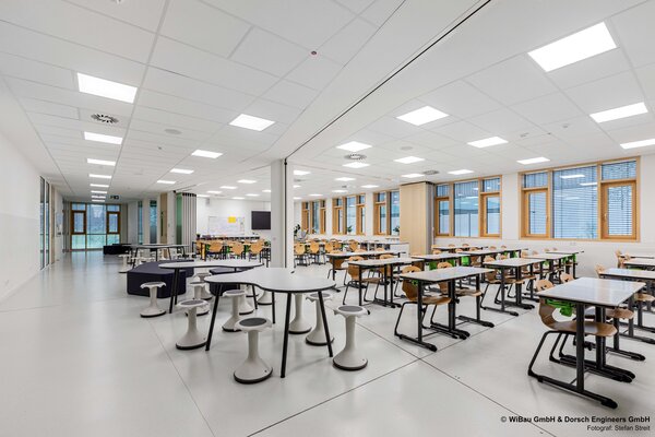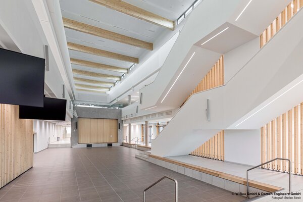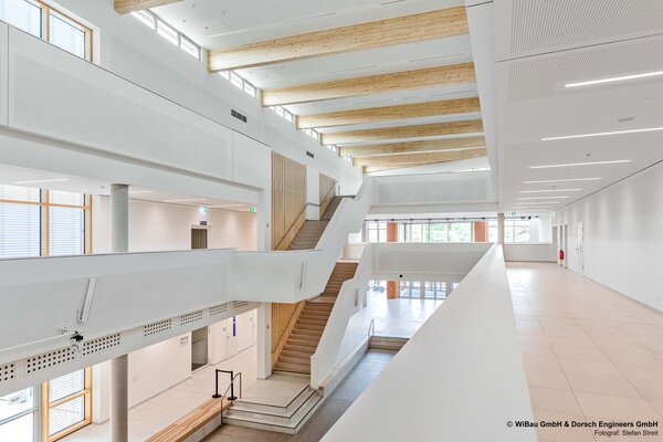 Die Elisabeth-Selbert-Schule in Wiesbaden ist ein modernes Gymnasium mit Lernhäusern, einer Zweifeld-Sporthalle mit begehbarer Dachterrasse, einer großzügigen Mensa und Aula sowie Fachbereichen für Musik, Kunst und Naturwissenschaften. Als Schule mit den Schwerpunkten Digitalisierung und Nachhaltigkeit bietet sie innovative Lernräume und digitale Arbeitsbereiche. Flexible Raumstrukturen und großzügige Außenflächen fördern gemeinschaftliches, selbstständiges und zukunftsorientiertes Lernen.