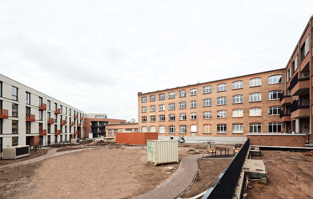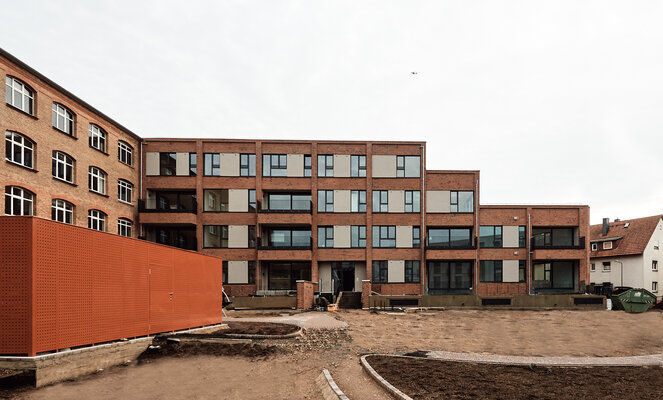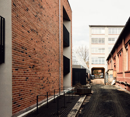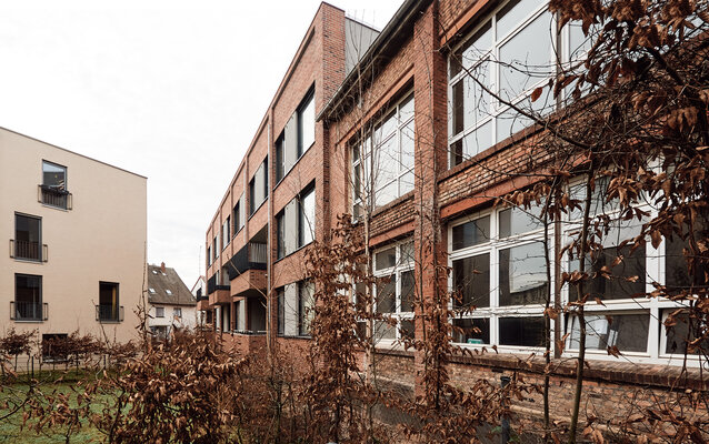 Die vorgefundene Bebauung einer ehemaligen Fabrik wird arrondiert, durch Neu- und Umbauten ergänzt und zu einem Ensemble aus Wohnen und Gewerbe auf einem Grundstück weiterentwickelt.