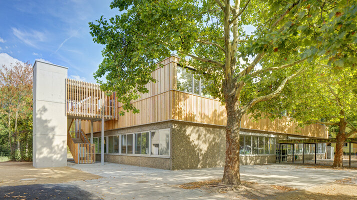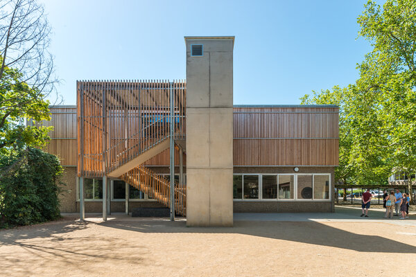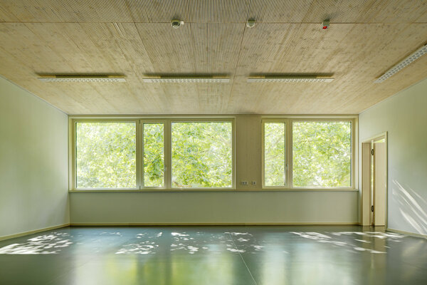 Es waren kurzfristig Ersatzflächen für 8 Klassen neu zu schaffen. Statt das Schulgelände weiter zu versiegeln, wurde die Aufstockung des einzigen ein-geschossigen Gebäudeteils geprüft. Das Gebäude definiert mit der Sporthalle und einem weiteren zweigeschossigen Baukörper die Ränder eines gut pro-portionierten Pausenbereichs mit attraktiven Bäumen. Die Aufstockung komplettiert dieses System optimal und schließt den Hof harmonisch ab. Aus-gezeichnet mit dem db-Preis „Respekt und Perspektive 2018“.