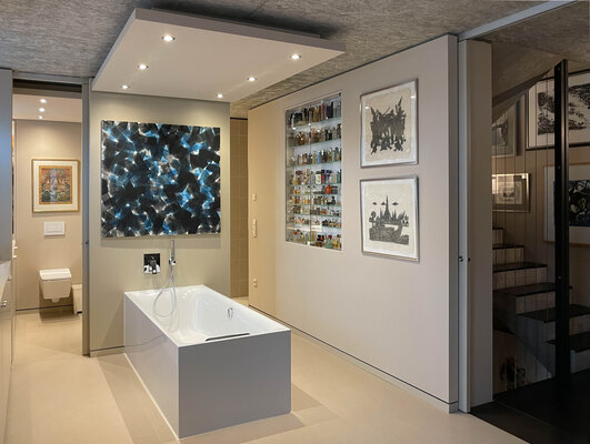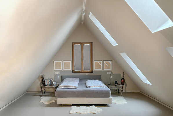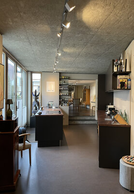 Das ursprüngliche Fachwerkhaus war wegen schwerer Bauschäden nicht zu retten. Der Neubau wurde mit der Maßgabe der Übernahme der Kubatur und Dachform des Vorgängerbaus genehmigt. Trotzdem konnten im Neubau angemessene Raumhöhen realisiert werden. Die Lage des sehr knappen Treppenhauses, die einheitliche Farbgebung von Fußböden, Wänden und Decken ermöglichen in dem begrenzten Gebäudevolumen großzügige Innenräume, die die umfangreiche Kunstsammlung der Bauherren angemessen zur Geltung bringen.