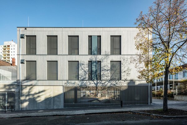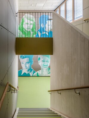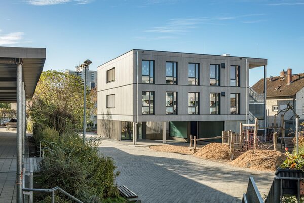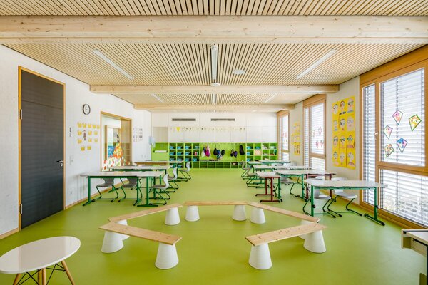 In kurzer Zeit entstand ein nachhaltiger Holzmodulbau mit je zwei Klassenzimmern inkl. Gruppenraum im 1. und 2. Obergeschoss. Sichtbare Holzoberflächen schaffen eine wohlige Atmosphäre und großzügige Sichtfenster zwischen den Klassen und Fluren eine offene Lernlandschaft, die neue pädagogische Konzepte fördert. Das teils aufgeständerte Erdgeschoss aus Stahlbeton erweitert den Pausenhof um eine überdachte Fläche, von der aus direkter Zugang zum Sanitärbereich und zur hocheffizienten Haustechnik besteht.