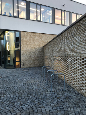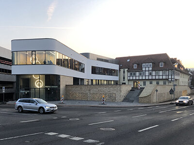 Die Erweiterung des Bestandsgebäudes arrondiert die städtebauliche Kante am Fuldaufer und schafft durch einen eleganten, transparenten Gebäudeflügel den attraktiven Auftakt zur Innenstadt. Der am historischen Sparkassengebäude verwendete Sandstein wird in Form einer changierenden, teilweise perforierten Ziegelverkleidung aufgegriffen und fügt sich in den Kontext ein. Der barrierefreie Zugang, das Foyer als Stadtbalkon und multifunktionale Räume schaffen zusätzliche Angebote in der Fachwerkstadt.