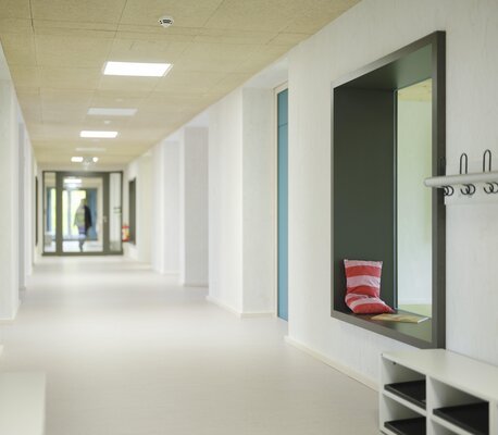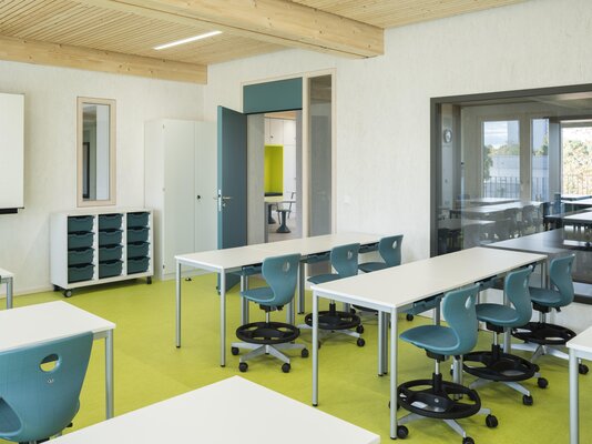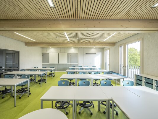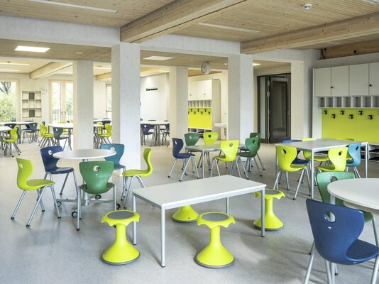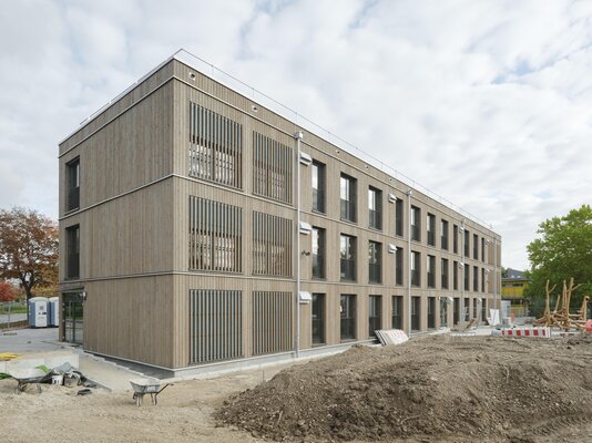Das Gebäude entstand in einer Gesamtbauzeit von nur elf Monaten aus 84 vorgefertigten Holzmodulen mit einer Fassade aus Lärchenholz. Im Erdgeschoss bieten Mensa mit Küche und ein Mehrzweckraum viel Platz für gemeinsames Lernen und Begegnung. Die oberen Etagen, die dank Aufzug barrierefrei gestaltet sind, beherbergen neun Klassenzimmer, offene Differenzierungsbereiche sowie ein Lehrerzimmer. Die Photovoltaik-Anlage auf dem Dach und eine DGNB-Zertifizierung unterstreichen den hohen Nachhaltigkeitsanspruch.