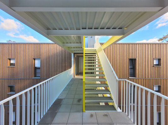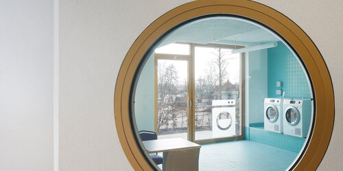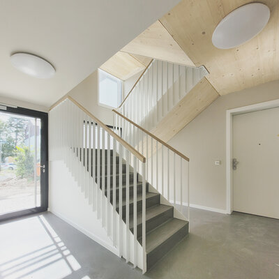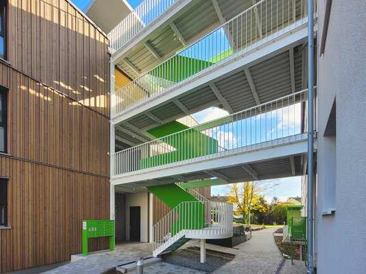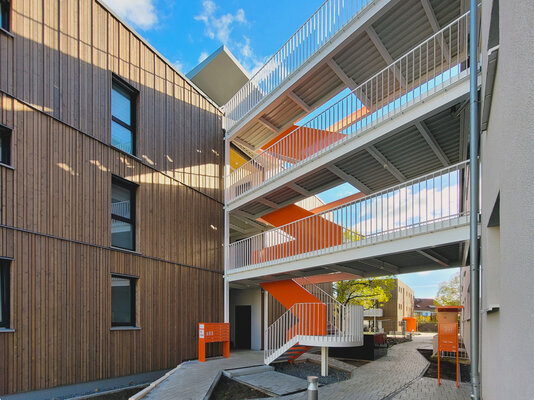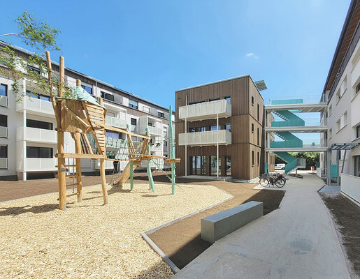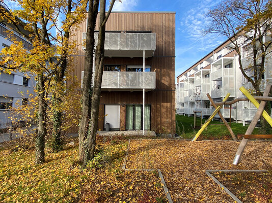 Mit Aufstockungen und dreigeschossigen „Satelliten“ aus Holz wurde eine Wohnanlage aus den 1960er-Jahren mit vier dreigeschossigen Zeilen weitergebaut. Gestaltprägend sind – neben den warmen Holztönen – die außenliegenden Stege mit Treppen, Aufzügen und Laubengänge, welche 62 der 124 Wohnungen barrierefrei erschließen. Durch die Setzung der Neubauten zwischen alten Bäumen, der Farben der Vordächer und Treppen entstehen lebendige Plätze, Spiel- und Grünflächen an mäandernden Wegen in offener Landschaft.