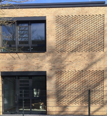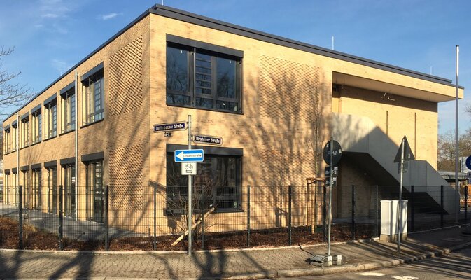 Die Erweiterung der von Otto Apel 1958 entworfenen denkmalgeschützten Schule wurde in einem zweigeschossigen Massivbau errichtet. Hier finden notwendige Klassenräume sowie Lehrerzimmer ihren Platz. Die klar strukturierte Klinkerfassade sowie die Dreiteilung der Fenster der denkmalgeschützten Bestandsgebäude wurden übernommen. Neue Akzente werden durch Klinkerreliefs gesetzt. Ein stufenloser Zugang bildet den gemeinsamen neuen Haupteingang für Hauptgebäude und Neubau.