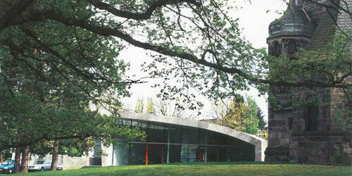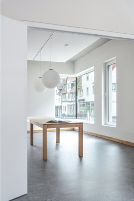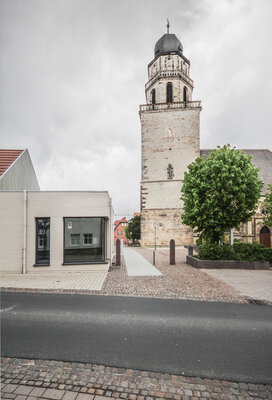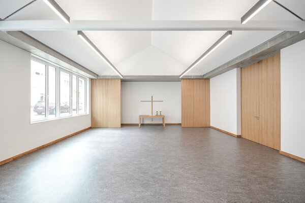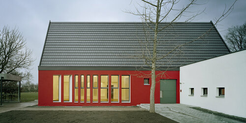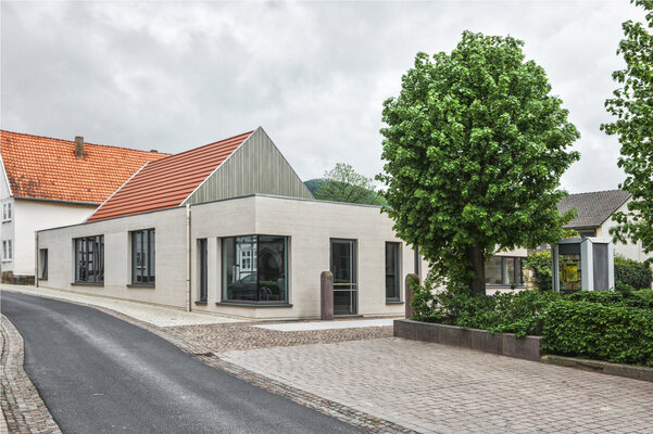 entlang der Mittelstraße ein. Der Saal wird durch ein Satteldach betont. Das Gebäude öffnet sich mit vielfältigen Ein- und Ausblicken zum Straßenraum und zur Kirche.