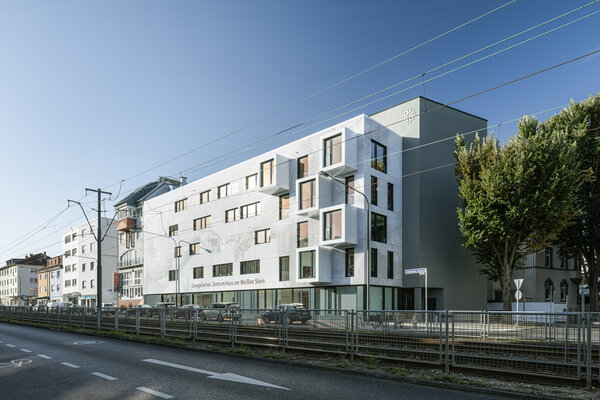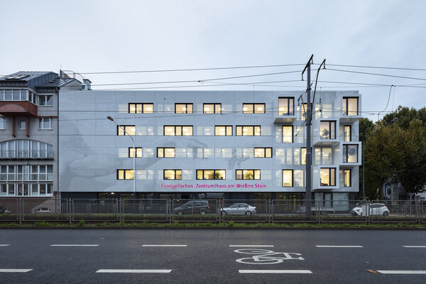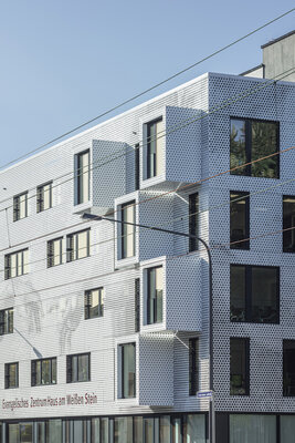 Für das Beratungszentrum wurde die alte Bandfassade des Bestandsbaus durch eine perforierte weiße Metallfassade mit fünf Erkern ersetzt, die das Bild »Die Erschaffung Adams« zitiert. Die Fassade ist nur partiell mit Öffnungen versehen, der Rest läuft vor den Fenstern durch. So entsteht abends ein transparenteres Bild als tagsüber und in den Räumen erzeugen die Kreuzöffnungen ein besonderes Interieur. Das Gebäude beherbergt verschiedene Beratungseinrichtungen der Evangelischen Kirche.