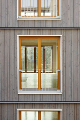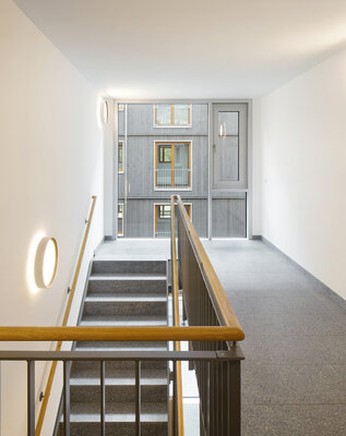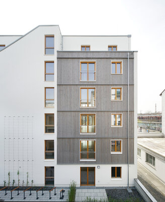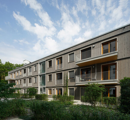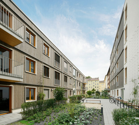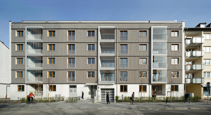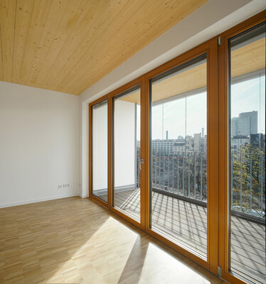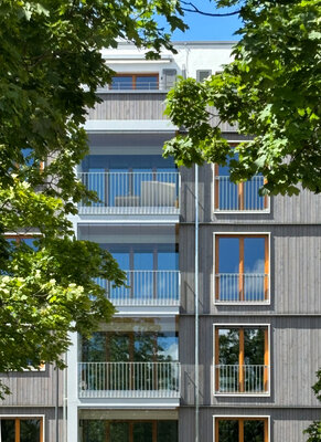In der Frankenallee 68/68 a in Frankfurt entstanden 2024 zwei Mehrfamilienhäuser in Holzmassivbauweise mit 43 Wohnungen und Innenhof. Das Vorderhaus mit sechs, das Hinterhaus mit drei Geschossen, fügt sich harmonisch ein. Tragende Elemente bestehen aus Brettsperrholz, ergänzt durch Stahlbeton. Eine Sondergenehmigung ermöglichte den Holzbau in Gebäudeklasse 5. Begrünte Dächer und Fassaden verbessern das Mikroklima, Loggien und große Fenster sorgen für Wohnlichkeit.
