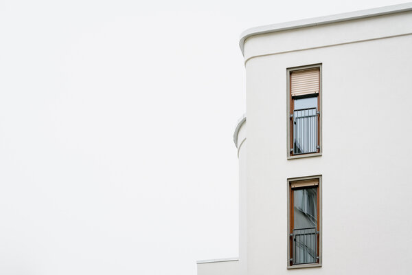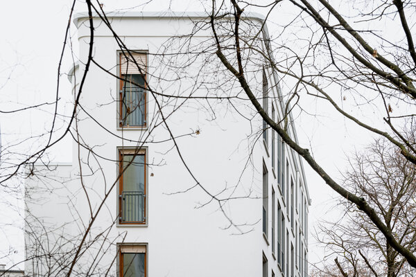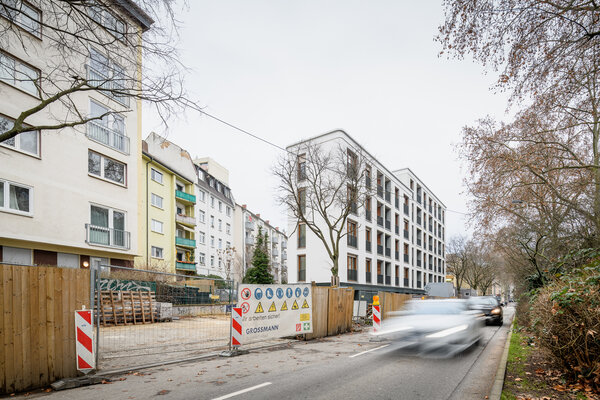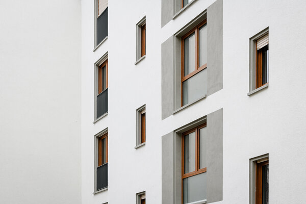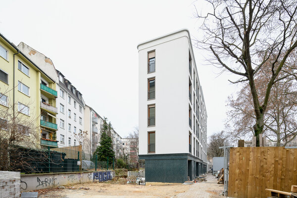 Das fünfgeschossige, aus zwei zueinander versetzten und unterschiedlich hohen Kuben bestehende Wohn- und Geschäftshaus nutzt geschickt ein schmales Restgrundstück an der Hanauer Landstraße und schließt östlich an ein bestehendes Gebäude an. Die Straßenfront zeigt sich als hell verputzte Lochfassade auf einem mit glänzenden grünlichen Keramikfliesen verkleideten Sockel, der dem Haus genau dort eine schöne Beständigkeit verleiht, wo es darauf ankommt: auf Augenhöhe.