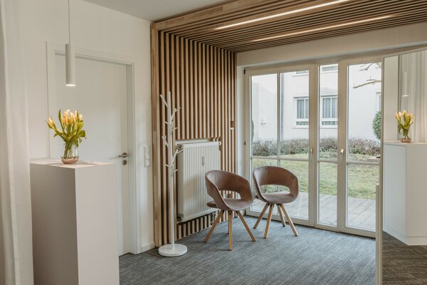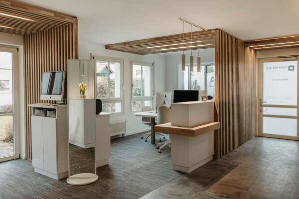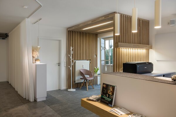optische Zonierung wurde entwickelt. Der Kunde wird von Bereich zu Bereich geleitet. Ein raumteilender Vorhang ermöglicht die flexible Nutzung für Privataufnahmen. Die Lichtplanung akzentuiert Bereiche mit LED-Paneelen.