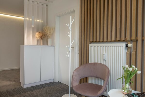 Das alte Büro wich einem modernen Fotostudio. Die Raumakustik wurde über Planung und Auswahl Material optimiert. Nachhaltige Teppichfliesen, raumgreifende Holz-Einbauten mit Beleuchtung im Arbeitsbereich schaffen eine gute Atmo sphäre. Einige Bereiche erhalten einen Hartbelag. Eine