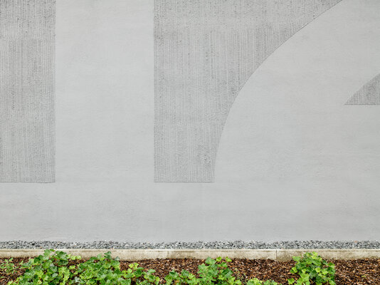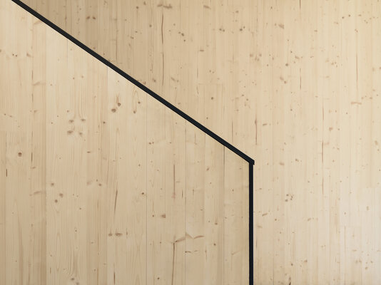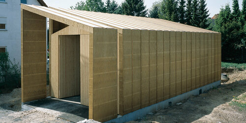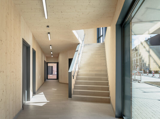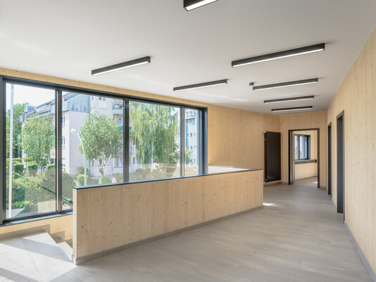 aus Brettschichtholzelementen mit einer Besenstrich- Putzfassade. Innenseitig bleiben die hölzernen Decken- und Wandoberflächen als Holzflächen sichtbar und erzeugen eine angenehme Raumatmosphäre.