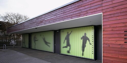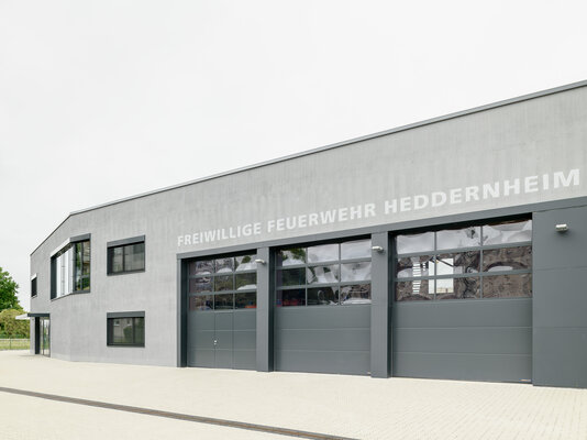 Der schiefwinklige Holzbau auf einer beengten Verkehrsinsel schafft Platz für die Freiwillige Feuerwehr Heddernheim und fügt sich mit ihren verschiedenen Gebäudefluchten achtsam in die Nachbarbebauung ein. Die kleine Feuerwache ist ein nachhaltiger, wirtschaftlicher und vorgefertigter Massivholzbau
