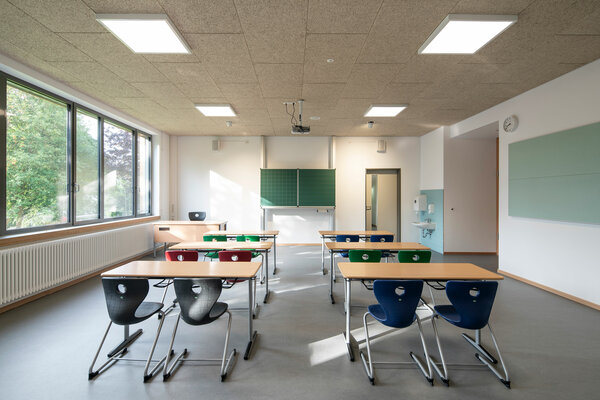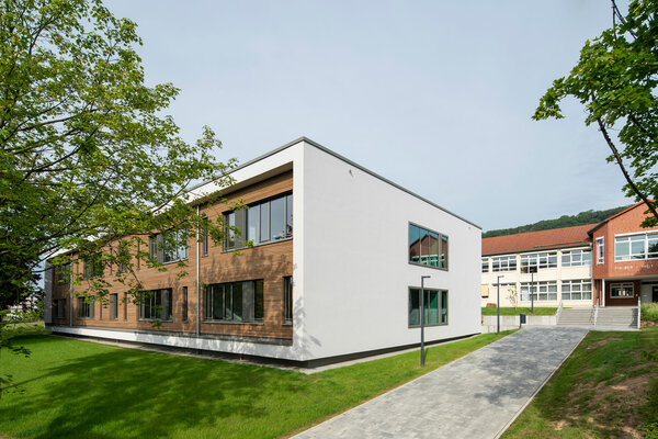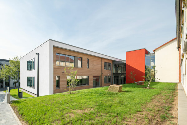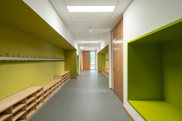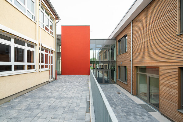 Der zweigeschossige Neubau ist über einen Verbindungsgang mit dem Altbau verbunden und ermöglicht durch den dort platzierten Aufzug die barrierefreie Erschließung des Alt- und Neubaus. Die Grundschule wird um 12 Klassenräume mit dazugehörigen Differenzierungsräumen, Lehrerteamräumen und weiteren Nebenräumen erweitert. Das abschließende Raumprogramm wurde in mehreren Workshops mit dem Lehrerkollegium entwickelt. Neubau und Umbau wurde bei laufendem Schulbetrieb realisiert.
